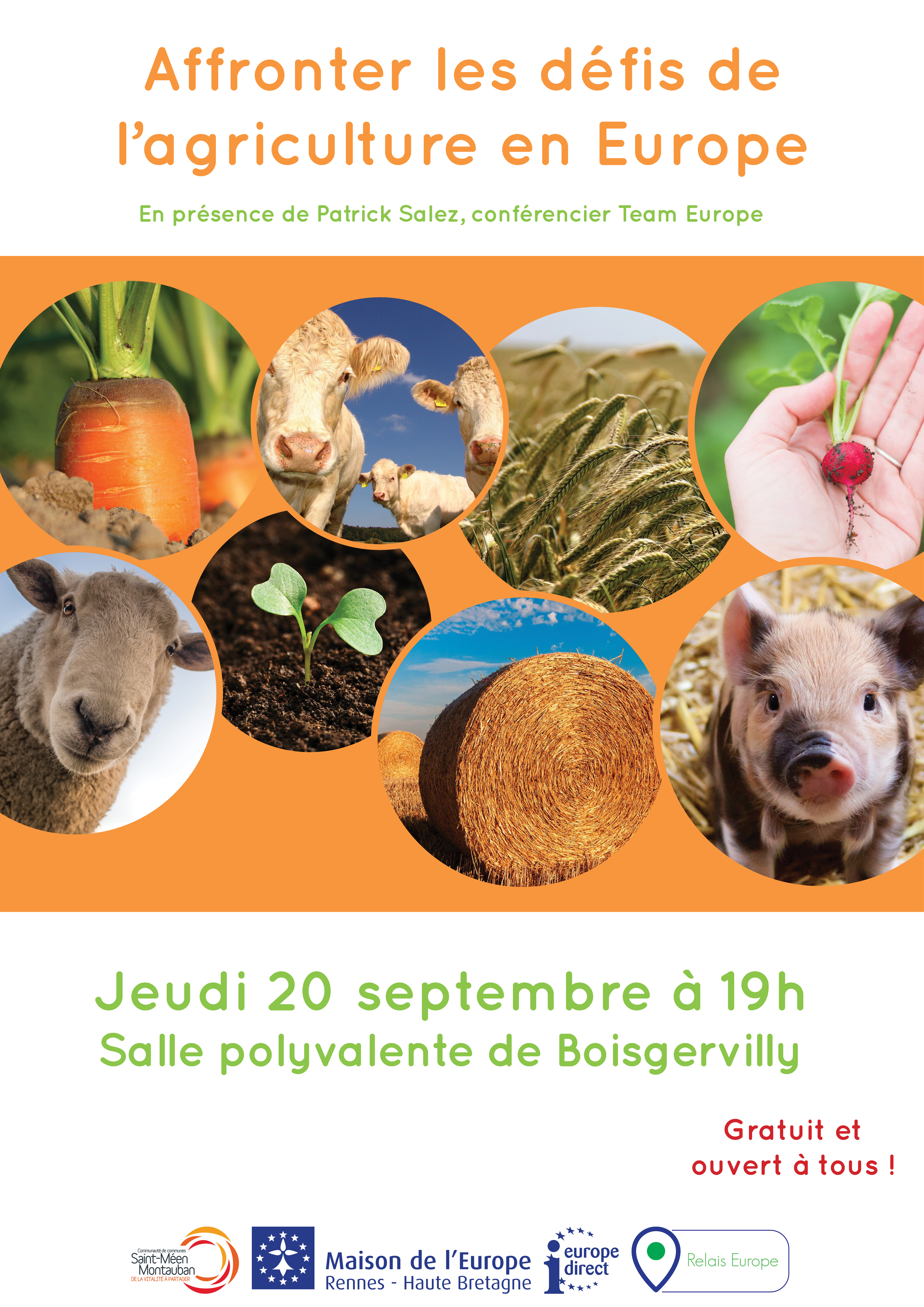Le jeudi 20 septembre à 19h, retrouvez-nous à la salle polyvalente de Boisgervilly pour un café européen sur le thème « Affronter les défis de l’agriculture en Europe ».