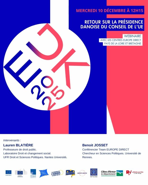 Mercredi 10 décembre 2025, le réseau des EUROPE DIRECT de Bretagne et des Pays de la Loire propose une conférence en ligne pour analyser les actions prises par le Danemark lors de sa présidence du Conseil de l’Union européenne ces six derniers mois. Depuis juillet 2025, le Danemark a pris la Présidence du Conseil […]